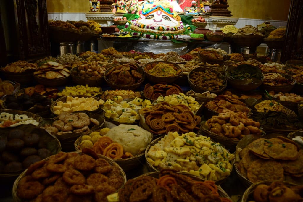 In ISKCON, devotees have developed unique offerings of halvah and sweets beautifully arranged in a replica of Govardhan Hill. Sometimes a Govardhan shila is placed on top of the hill. Devotees jubilantly circumambulate the hill of sweets and worship it as Govardhan Hill itself. A sumptuous feast is served on the occasion.